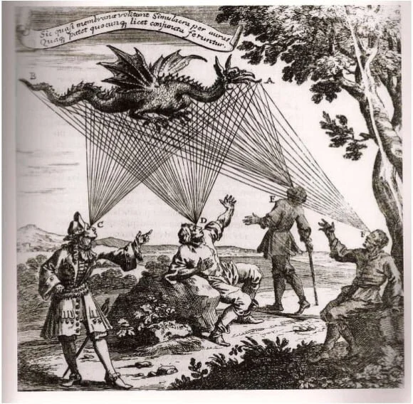 Today, we know that sight is made possible when photons from a light source bounce off the object of our sight and into our eyes, delivering the information necessary for our brains to construct a reasonably accurate image of what we are seeing. Up until at least the eighteenth century, however, most people believed that the light rays required for sight originated from the eyes themselves. These light rays were understood literally to shoot out from the eyes, travel to the perceived object, physically pick up a tiny imprint of that object, and then finally carry that imprint back to the eye along the same ray with which the process started. In this way, every time an individual looked at an object, a tiny version of that object was physically imprinted on the eye’s receivers.